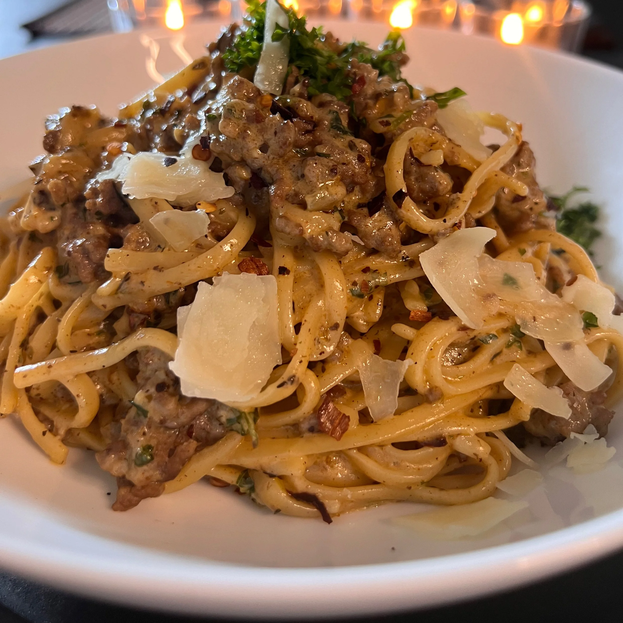 When pasta is done turn sauce back on low and add pasta directly from pasta water to sauce. Stir